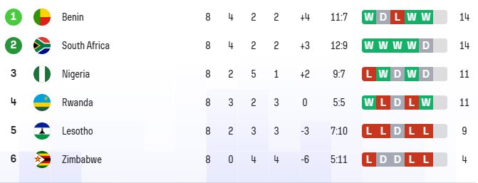 Јужна Африка сега е на чело на квалификациската група Ц со 14 бода, како и Бенин, а Нигерија и Руанда имаат по 11.