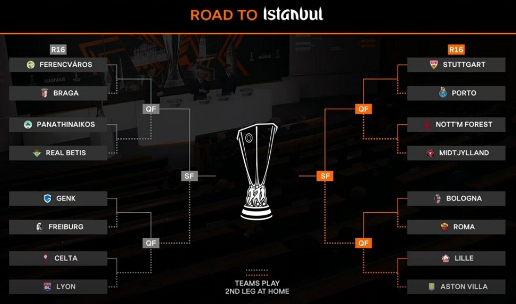 Во седиштето на УЕФА, во Нион, беа извлечени двојките за осминафинаето во Лига Европа Оваа фаза од ова натпреварување на УЕФА ќе го обелижи италијанската пресметка меѓу Болоња и Рома, а внимание секако привлекува и германско-портигалската пресметка Ѓтитгарт-Порто.