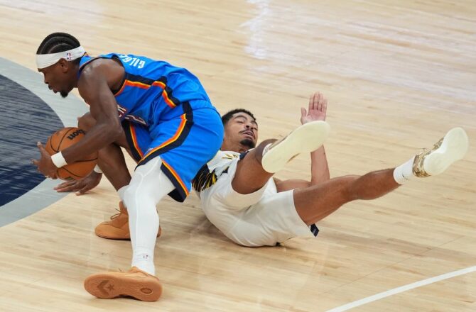 Оклахома Сити Тандер, актуелните шампиони на НБА лигата, славеа на гостински терен по две продолженија против тимот на Индијана со резултат 141:135.