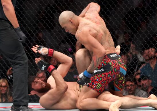 Анкалаев падна на подот, а Переира го принуди судијата да го прогласи крајот на борбата со серија брутални удари и лакти.